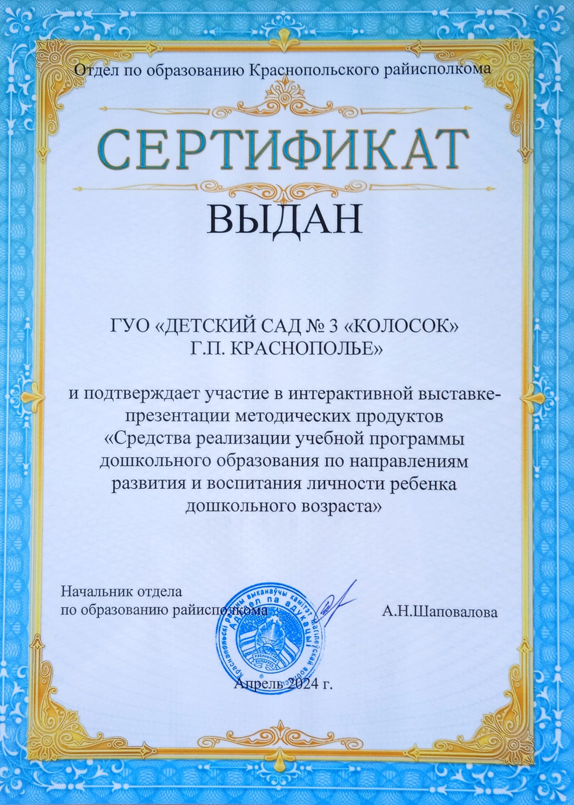Благодарность отдела по образованию,спорту и туризму Краснопольского райисполкома за активное участие в проектеДата события: