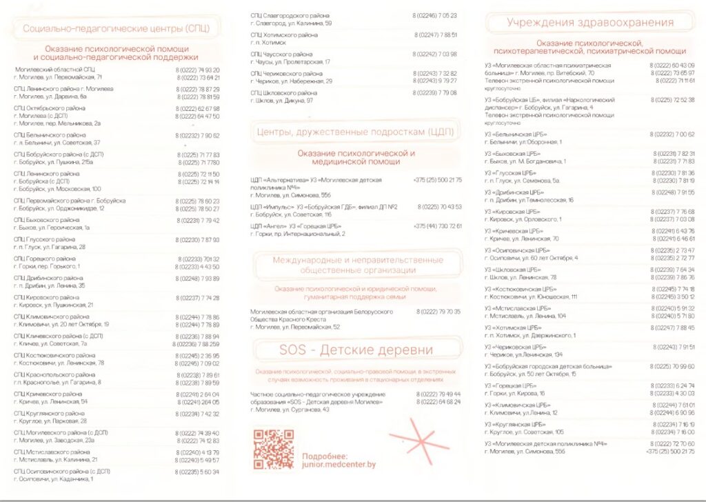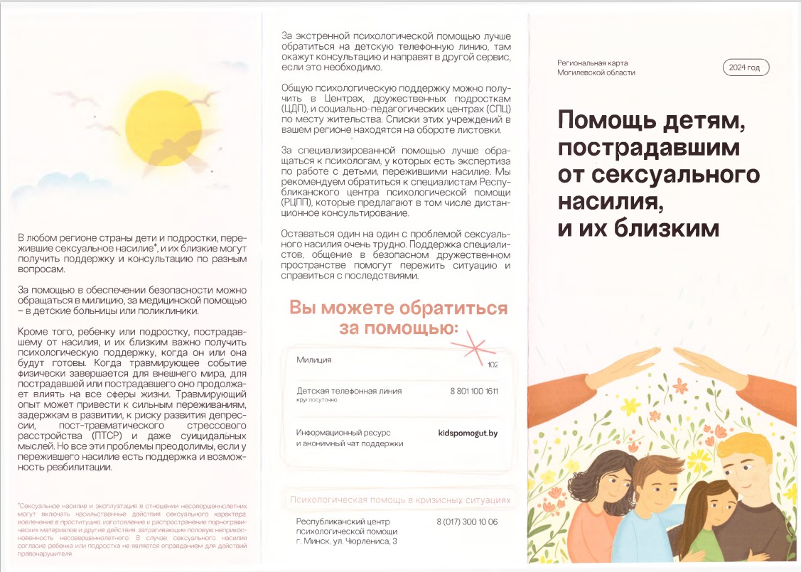 Профилактика преступлений против половой неприкосновенности несовершеннолетних Алгоритм информирования педагогическими работниками родителей, опекунов, попечителей обучающихся и (или) сотрудников органов внутренних дел о наличии признаков насилия в отношении несовершеннолетних. Методические рекомендации по своевременному выявлению и информированию специалистами учреждений образования, здравоохранения, культуры, физической культуры и спорта, работающих с детьми и молодежью, по выявлению признаков сексуального насилия и эксплуатации в отношении несовершеннолетних, алгоритму действий при выявлении, порядку информирования об этом правоохранительных органов Национальный механизм оказания помощи несовершеннолетним, пострадавшим от сексуального насилия и эксплуатации. «Региональная карта помощи несовершеннолетним, пострадавшим от сексуального насилия или эксплуатации Могилевской области» Перечень организаций, в том числе общественных Краснопольского района, оказывающих правовую, социальную, психологическую и иную помощь семьям с детьми по устранению трудной жизненной ситуации.